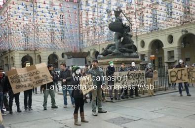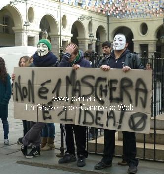 TORINO – Poliziotti schierati di fronte alla porta del Comune per una manifestazione indetta da esponenti del Gruppo “Anonymous”, martedì in 105 città. Maschere bianche a coprire il volto di alcuni di lori e ad accompagnare i tanti striscioni, la scritta “Non è una maschera, è un’idea”. C’è rammarico per una partecipazione ridotta nel numero dei partecipanti nonostante, ha sottolineato uno di loro, «sia stata organizzata da circa un anno e la scelta del 5 novembre non è a caso, ma vuole riprendere il film “V per vendetta”. Una manifestazione pacifica e la volontà è quella
