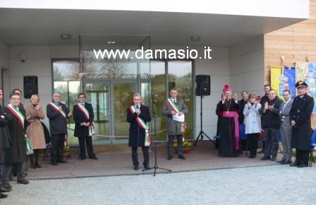 A fare gli onori di casa in una giornata di festa caratterizzata dalla presenza dei bambini, dei loro familgiari, delle maestre, di Amministratori e cittadini, il Sindaco di Scarmagno Luigi Bot Sartor ed il Presidente della Comunità Collinare Piccolo Anfiteatro Morenico e Sindaco di Strambino Savino Beiletti, i Sindaci di Romano, Perosa, Mercenasco, San Martino, Vialfrè, ad accogliere il Vescovo di Ivrea, Monsignor Aldo Cerrato, che ha benedetto la nuova scuola consortile.