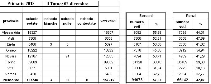 Anche in Piemonte, con l’eccezione della provincia di Cuneo, Pierluigi Bersani stacca nettamente Matteo Renzi.