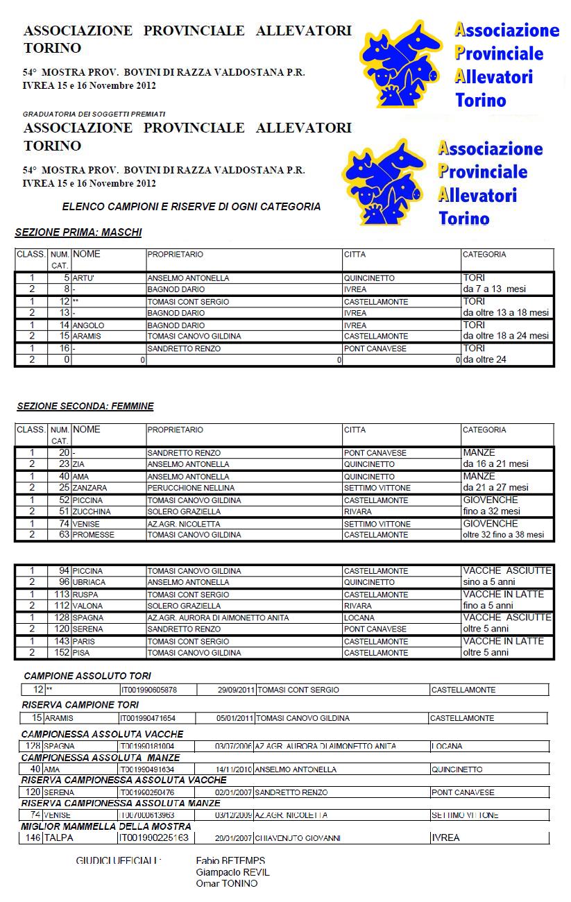 – Allevamenti presenti e capi presentati: Anselmo Antonella (Quincinetto) 6, Az. Agr. Aurora Di Aimonetto Anita (Locana) 5, Az. Agr. Nicoletta (Settimo Vittone) 5, Bagnod Dario (Ivrea) 20,