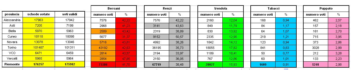 Bersani 41,70%, Renzi 38,48 %, Vendola 15,93%, Puppato 2,98% e Tabacci 0,91%.