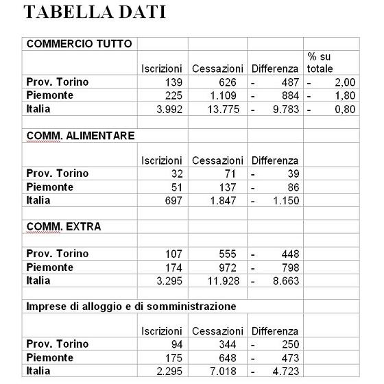 In un quadro negativo che caratterizza tutta Italia, Torino e provincia risultano ancora più penalizzate: Torino è la seconda città capoluogo per chiusure dopo Roma; il saldo negativo chiusure/aperture rappresenta il 2% sul totale contro l’1,80% del Piemonte e lo 0,80% dell’Italia.
