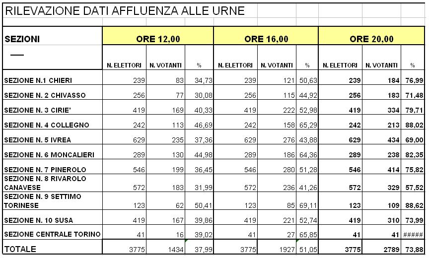 I 3775 elettori (Sindaci e Consiglieri comunali) hanno votato nel seggio di via Maria Vittoria a Torino e in altri dieci comuni del torinese: Chieri, Chivasso, Ciriè, Collegno, Ivrea, Moncalieri, Pinerolo, Rivarolo Canavese, Settimo Torinese e Susa. In Canavese sono stati registrati i dati più bassi della affluenza alle urne: il 69% a Ivrea ed il 59,5% nella sezione di Rivaolo.