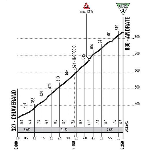 I 36 chilometri finali accentuano le difficoltà con la salita per Andrate: uno strappo di 5,8 chilometri con una pendenza media dell’8,8% e punte fino al 12%. E proprio in questo tratto la sede stradale si restringe, rendendo più difficoltoso il passaggio dei ciclisti.