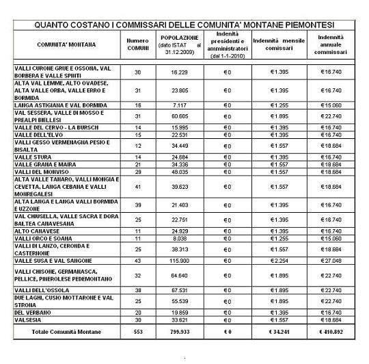 Ad esempio, il commissario della Comunità montana Valli Orco e Soana (11 Comuni e 8mila abitanti) percepirà 1.255 euro lordi al mese, per complessivi 15.060 euro l’anno. Il commissario della Comunità montana Valli Chiusella, Sacra, Dora Baltea Canavesana (25 Comuni e 22.700 abitanti) riceverà 1.395 euro l’anno per complessivi 16.740 euro in un anno.