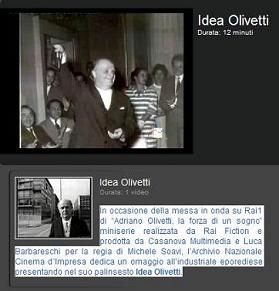 In occasione della messa in onda su Rai1 di “Adriano Olivetti, la forza di un sogno”, miniserie realizzata da Rai Fiction e prodotta da Casanova Multimedia e Luca Barbareschi per la regia di Michele Soavi, l’Archivio Nazionale Cinema d’Impresa dedica un omaggio all’industriale eporediese presentando nel suo palinsesto Idea Olivetti. Il filmato, realizzato nel 2011 in occasione delle celebrazioni per i cinquant’anni della morte di Adriano Olivetti, è un montaggio di estratti di interviste fatte ad ex collaboratori di Adriano. Fra gli intervistati spiccano le figure di Furio Colombo, Franco Ferrarotti, Massimo Fichera, Gianluigi Gabetti e molti altri. L’archivio, a partire dalle interviste rilasciate, ha selezionato una serie di riflessioni ed aneddoti dedicati all’intellettuale eporediese ed ha individuato due nuclei tematici: Adriano Olivetti quale scopritore di talenti e il concetto di Estetica della fabbrica per l’imprenditore illuminato.