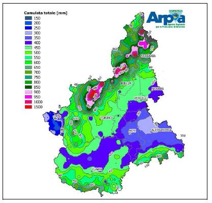 1158 mm a Montecrestese (Vb); 1146 mm a Trivero (Bi); 1117 mm a Traversella (To) e Corio (To); 679 mm ad Angrogna (To); 612 Briga alta (Cn). In altri termini, le precipitazioni di tale periodo hanno uguagliato o superato le precipitazioni media annue regionali.