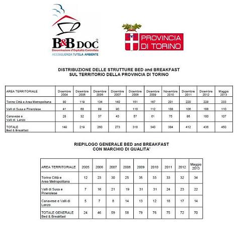 Attualmente in provincia di Torino i Bed & Breakfast sono 450 (erano 149 a fine 2004 e 260 a fine 2006). Sono 70 gli esercizi muniti del Marchio di Qualità (erano 24 a fine 2005 e 46 a fine 2006), così suddivisi: 34 in Torino città nell’area metropolitana, 14 nel Canavese e nelle Valli di Lanzo, 22 in Valle di Susa e nel Pinerolese.