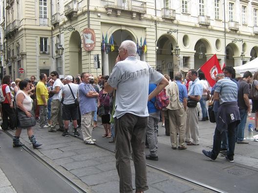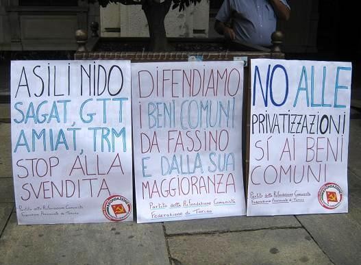 Dito puntato contro la pesante cementificazione del territorio, avviata dagli anni ’90 allo scopo, sottolineano i manifestanti, “di colmare con gli oneri di urbanizzazione il cratere di 3,4 miliardi di euro di debito fatto per la realizzazione dello Stadio delle Alpi e le Olimpiadi, per le consulenze, lo star system nel settore della cultura e studi professionali, per l’inceneritore, gli stipendi favolosi a dirigenti e consulenti. Mentre gli amministratori si disinteressano, perché complici, dell’inesorabile dismissione della produzione Fiat e le gravi conseguenze che produrrà sul piano occupazionale e sociale, nonostante la Fiat per decenni abbia ricevuto a fondo perduto i soldi dei contribuenti senza che gli siano state chieste garanzie. Conclude il volantino: “Si accaniscono nel tartassare i cittadini con l’Imu più alta nel contesto nazionale, l’addizionale Irpef portata al massimo consentito dalla legge per tutti, l’aumento della tassa per la raccolta dei rifiuti e l’innalzamento di altri tributi locali. Non ancora contenti stanno operando per svendere la gestione delle aziende partecipate (Gtt, Amiat, Iren) volgendo per questa via verso la privatizzazione di servizi essenziali.”