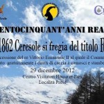 Il comune di Ceresole Reale, il Parco Nazionale Gran Paradiso e Cesma Formazione e cultura organizzano per sabato 29 dicembre “Centocinquant’anni reali” presso il centro visitatori del Parco “Homo et Ibex” in località Prese. Sarà festeggiata la ricorrenza della concessione del titolo di “Reale” a Ceresole, da parte di re Vittorio Emanuele II, avvenuta nel 1862, al quale il Comune aveva ceduto gratuitamente i diritti di caccia a camosci e stambecchi.